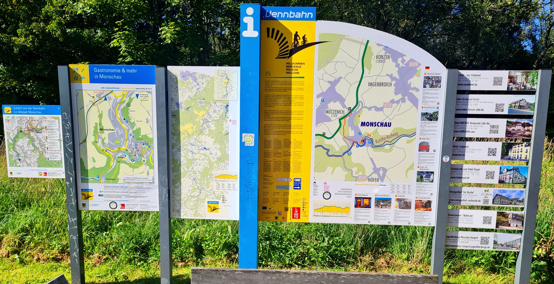 Nach dem Wendepunkt geht es bei Monschau wieder über die Grenze nach Deutschland. Noch vor dem Grenzübertritt kommt ein alter Eisenbahnwagon, wo es echte belgische Waffeln gibt. Bessere wirst du wohl kaum finden. Eine Pause ist hier fast schon verpflichtend. Danach geht es innerhalb von Deutschland auf belgischen Hoheitsgebiet weiter. Es kommen Bänke, Spielplätze, Sehenswürdigkeiten und Geschichten zum Vennradweg, die alles für jeden möglich machen, der hier unterwegs ist. Kilometer um Kilometer fahren wir ohne große Kraftanstrengung weiter. In der Höhe Lammersdorf verlassen wir dann den Radweg und kehren auf die Straße zurück. Ein weiteres Verweilen würde die Rückkehr extrem verlängern und die Tour auf gut und gerne 200 Kilometer anwachsen lassen. Es geht auf der Höhe mit einigen sehr schönen Ausblicken nach Vossenack.