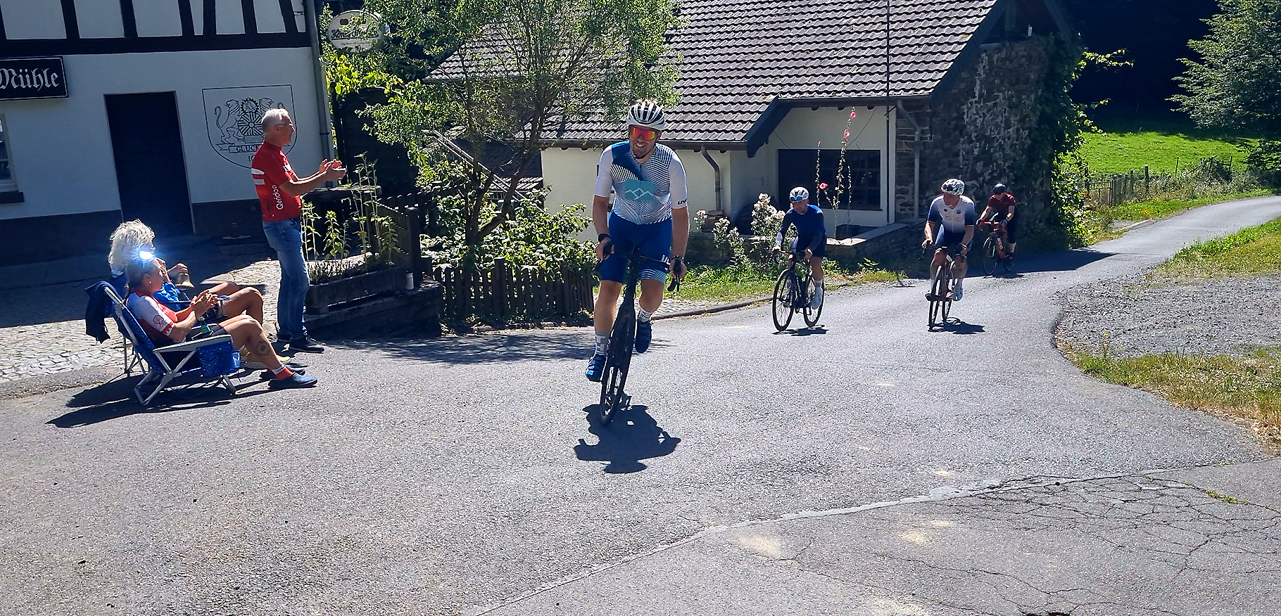 Die Leidenschaft, der Spaß, die Verpflegung und auch die gewählte Strecke sollte zum Höhepunkt dieses Sonntags führen. Die in der Spitze 250 Fahrer auf dem Rundkurs fühlten sich an, als ob das doppelte Teilnehmerfeld gewesen wäre. Fahrer aller Leistungsklassen gesellten sich an dem schon etwas gemeinen Anstieg zum malerischen Masbachtal, vorbei an der Nescher Mühle bis nach Neschen zusammen. Gemeinsam leidet es sich am besten und gegenseitiges Mitleid hat noch nie geschadet :-).
